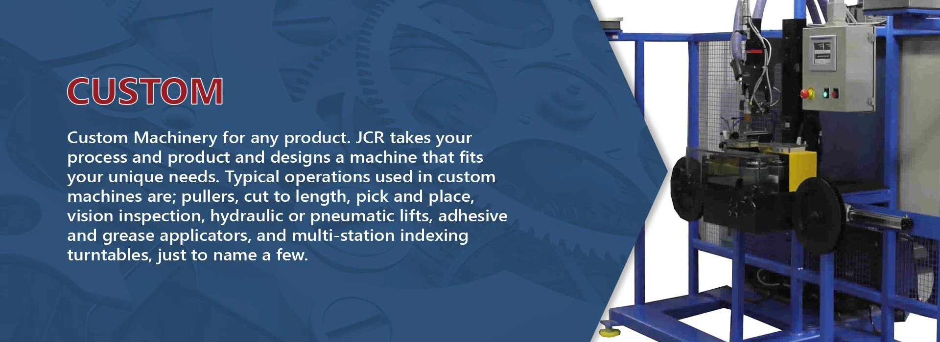 At JCR, custom machinery is the backbone of our business. Our designs include cut to length machines, automated assembly systems, croppers, water jet cutters, pick and place systems, label applicators, and many more. Since our machines are custom designed, we are involved in any industry where manufacturing and assembly takes place, such as automotive parts, hand tools, cast metal parts, RV windows, and poppet valves. Let JCR work with your engineering and production personnel to produce an efficient machine at an affordable price.